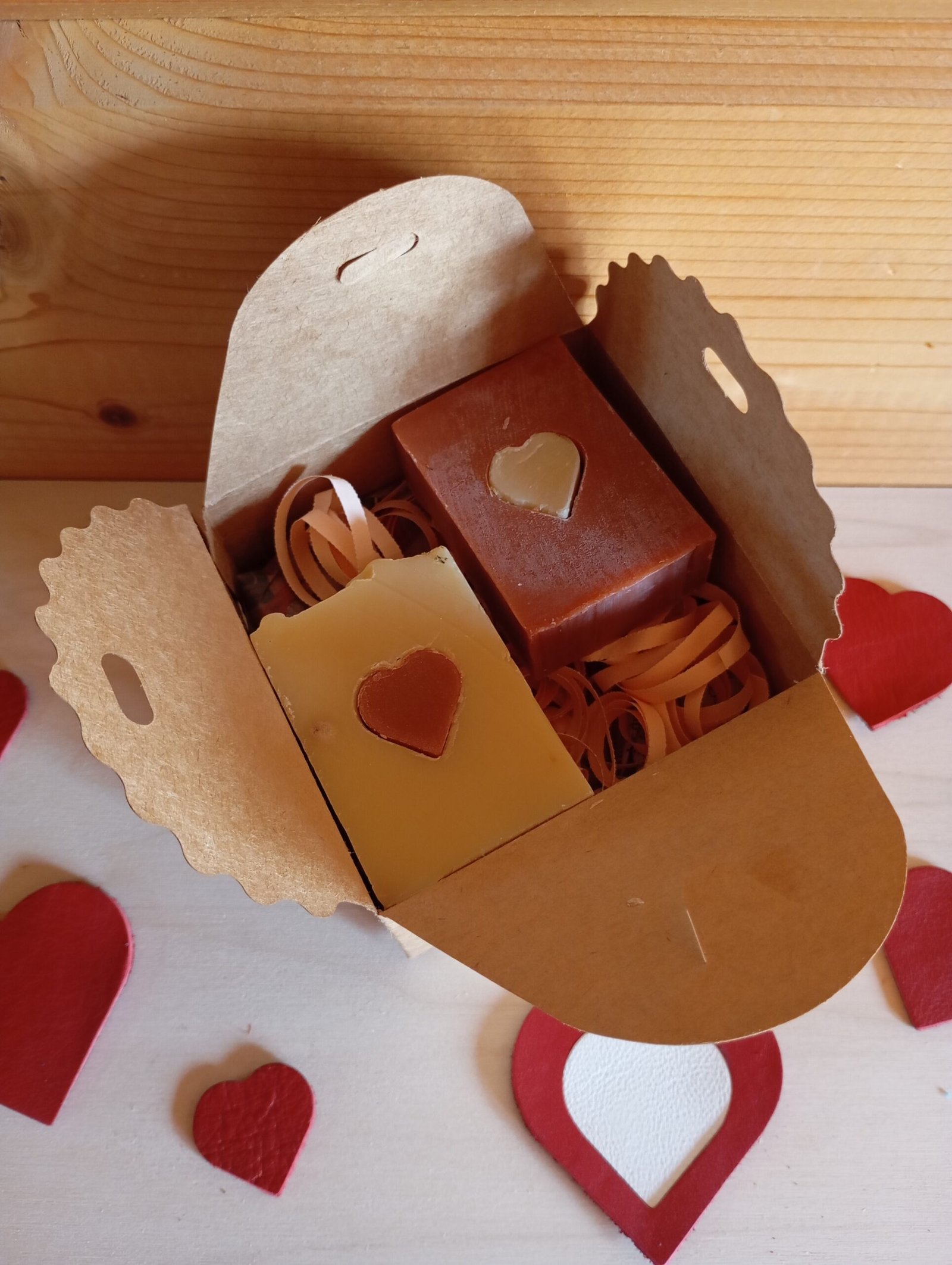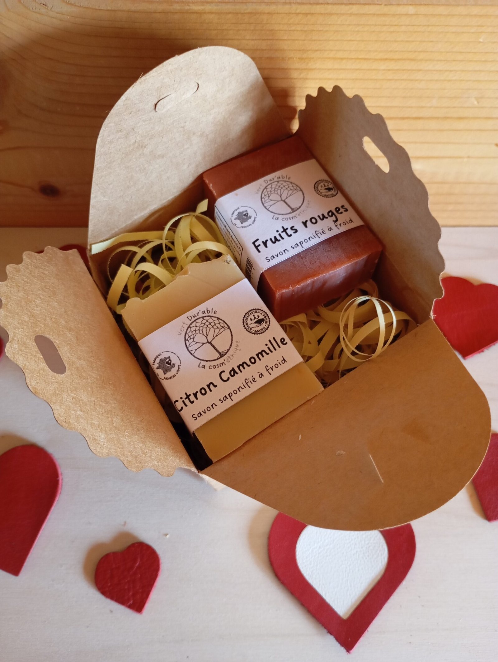 2 demi-savons citron-camomille et fruits rouges, dont le cĹ“ur est Ă©changĂ© (vous pouvez choisir d’autres parfums en me laissant un commentaire).